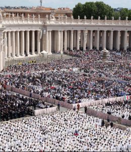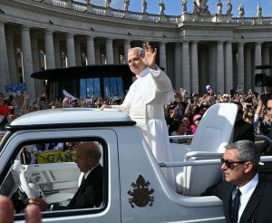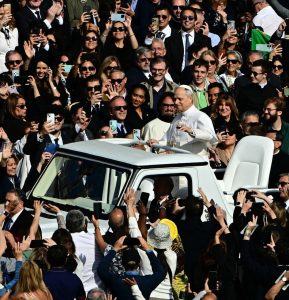 Riding in the popemobile, the new pontiff greeted the cheering crowd before delivering his first homily inside St. Peter’s Basilica.