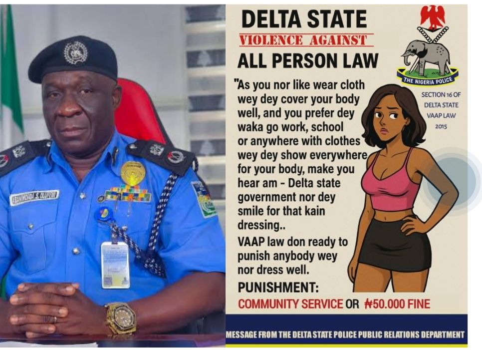 “As you nor like wear cloth wey dey cover your body well, and you prefer dey waka go work, school, or anywhere with clothes wey dey show everywhere for your body, make you hear am – Delta state government nor dey smile for that kain dressing. VAAP law don ready to punish anybody wey nor dress well.”