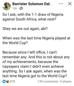Former Minister of Sport Dalung has expressed concern over Nigeria’s chances of qualifying for the 2026 World Cup following a 1-1 draw away to South Africa in Bloemfontein.
