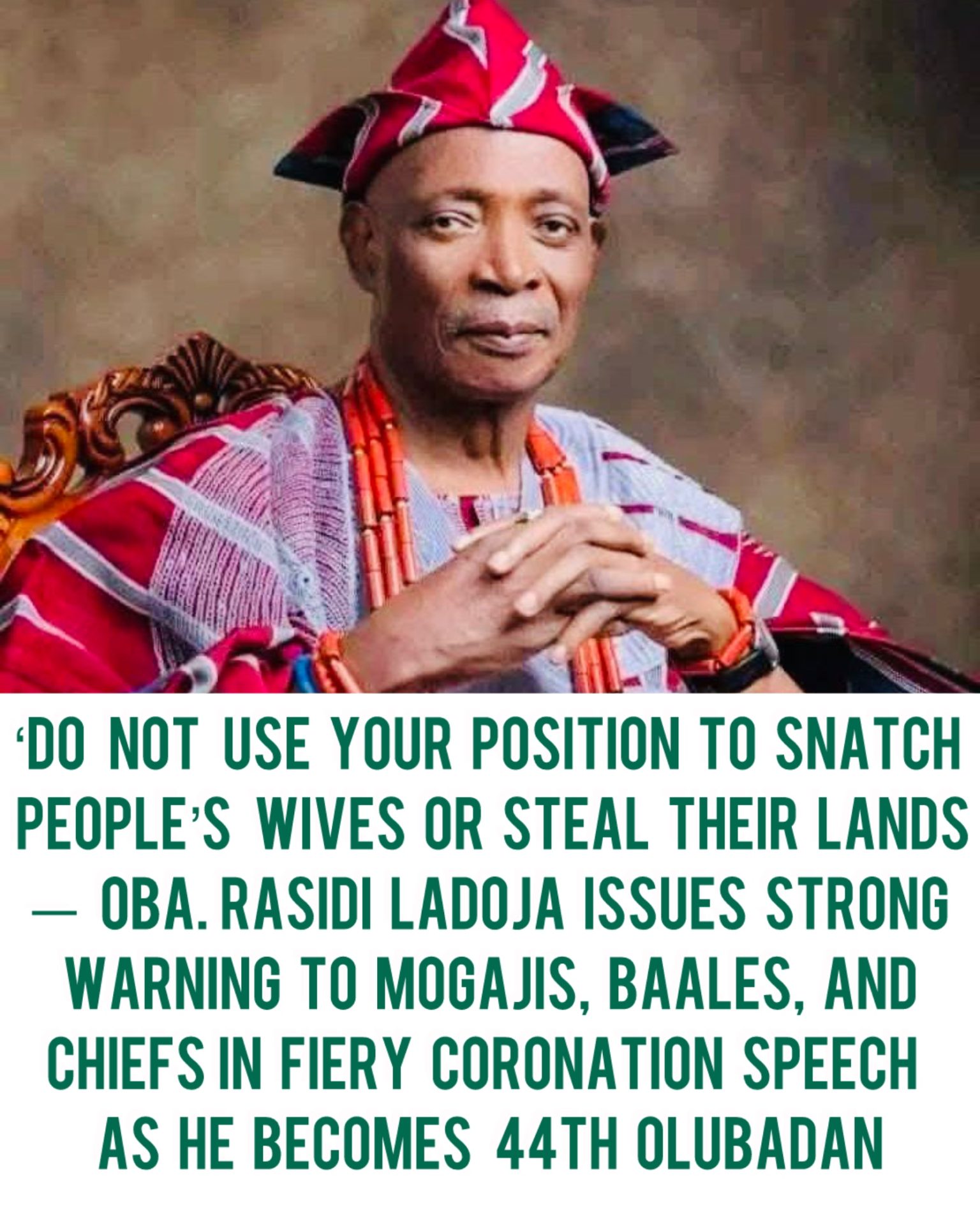 The newly coronated Olubadan of Ibadanland, Oba Rasidi Adewolu Ladoja, has cautioned traditional title holders against abusing their influence to seize people’s wives and lands.
