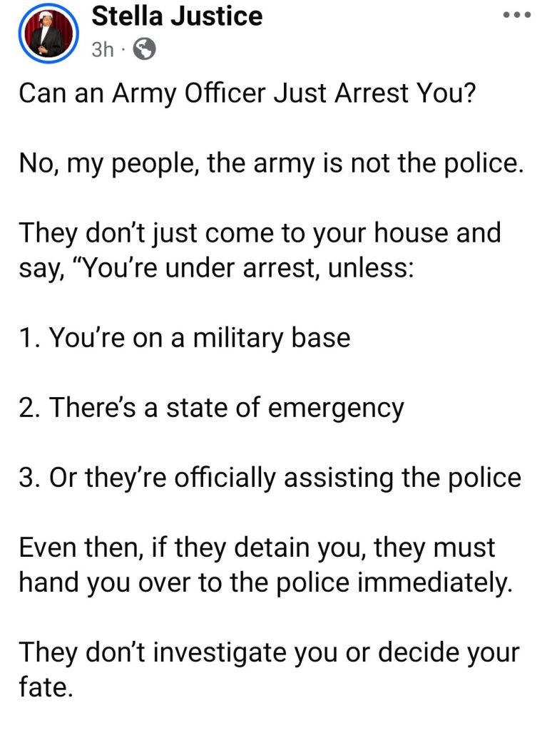 “Even then, they must hand over anyone detained to the police immediately. The army cannot investigate or decide your fate,” Stella wrote. She added that the military also cannot arrest police officers on a whim.