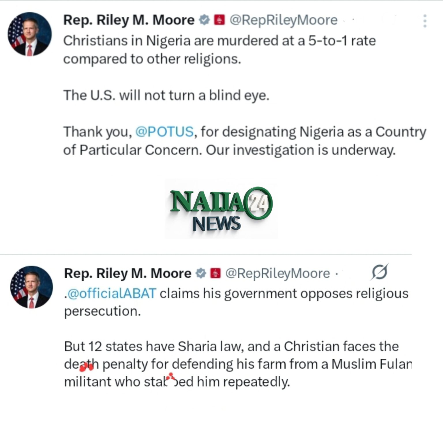 US Congressman Riley M. Moore has renewed his criticism of Nigeria’s handling of religious violence, claiming Christians are being targeted at a five-to-one rate compared to Muslims.