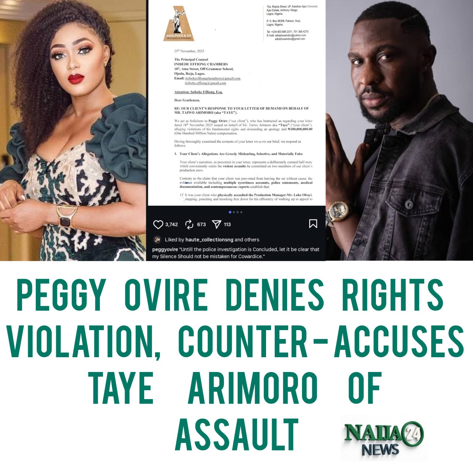 Nollywood actress Peggy Ovire has issued a formal response to the ₦100 million demand letter from Taye Arimoro.