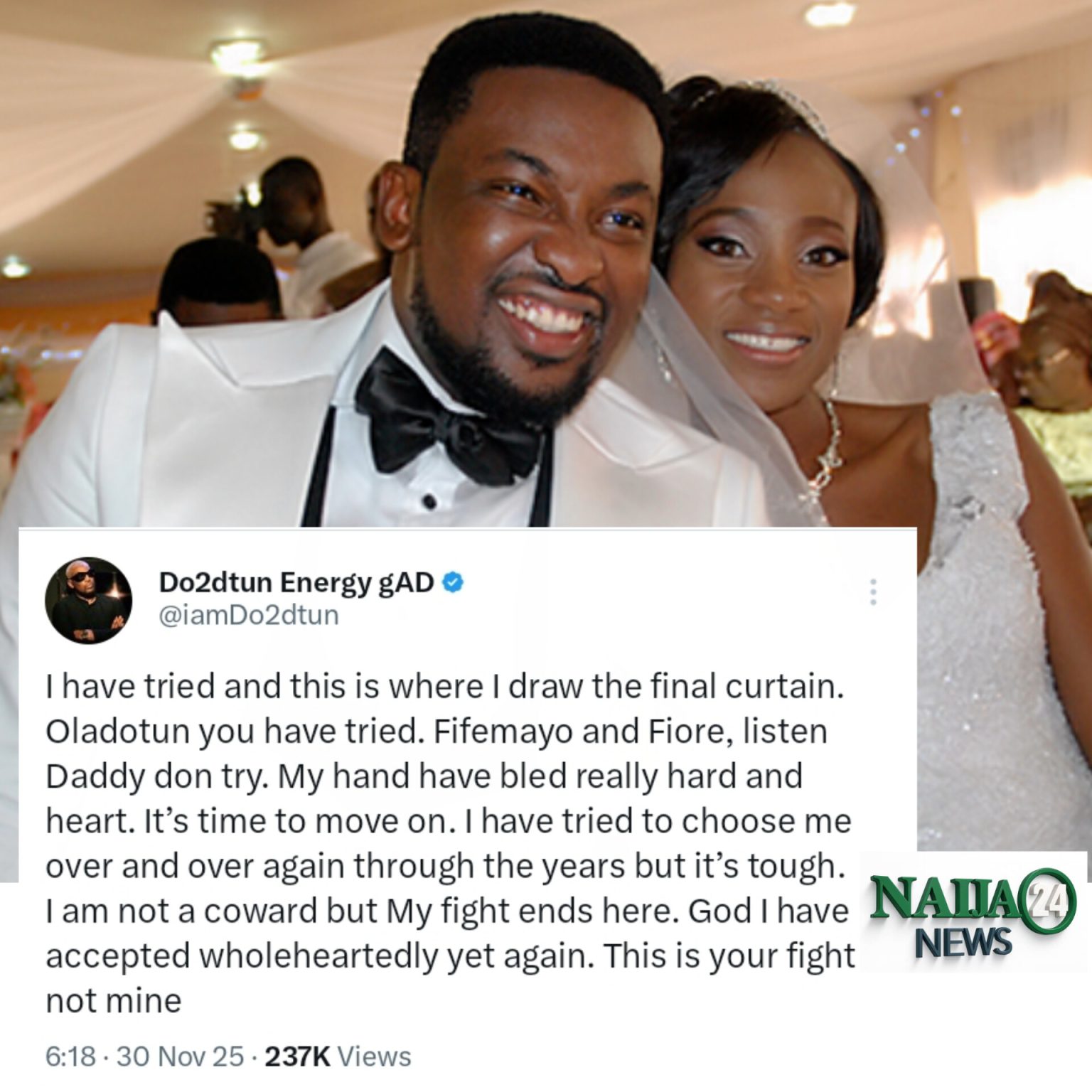 In the emotional post, Do2dtun wrote that he has “drawn the final curtain”, saying his hands and heart have “bled really hard” over the years as he struggled to be in his children’s lives. He addressed his girls — Fifemayo and Fiore — telling them he has fought endlessly, but the battle has taken a painful toll.